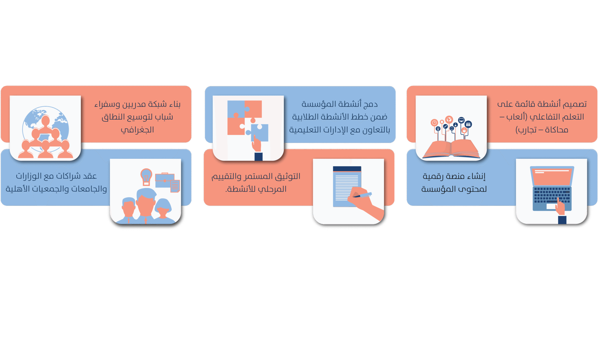 - ورش عمل تفاعلية داخل المدارس والجامعات.