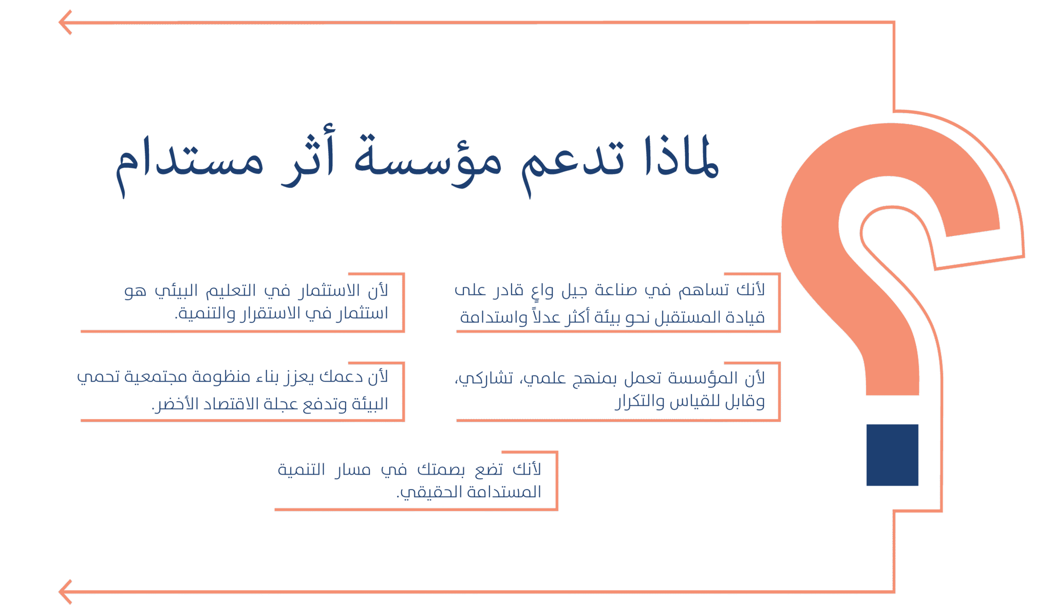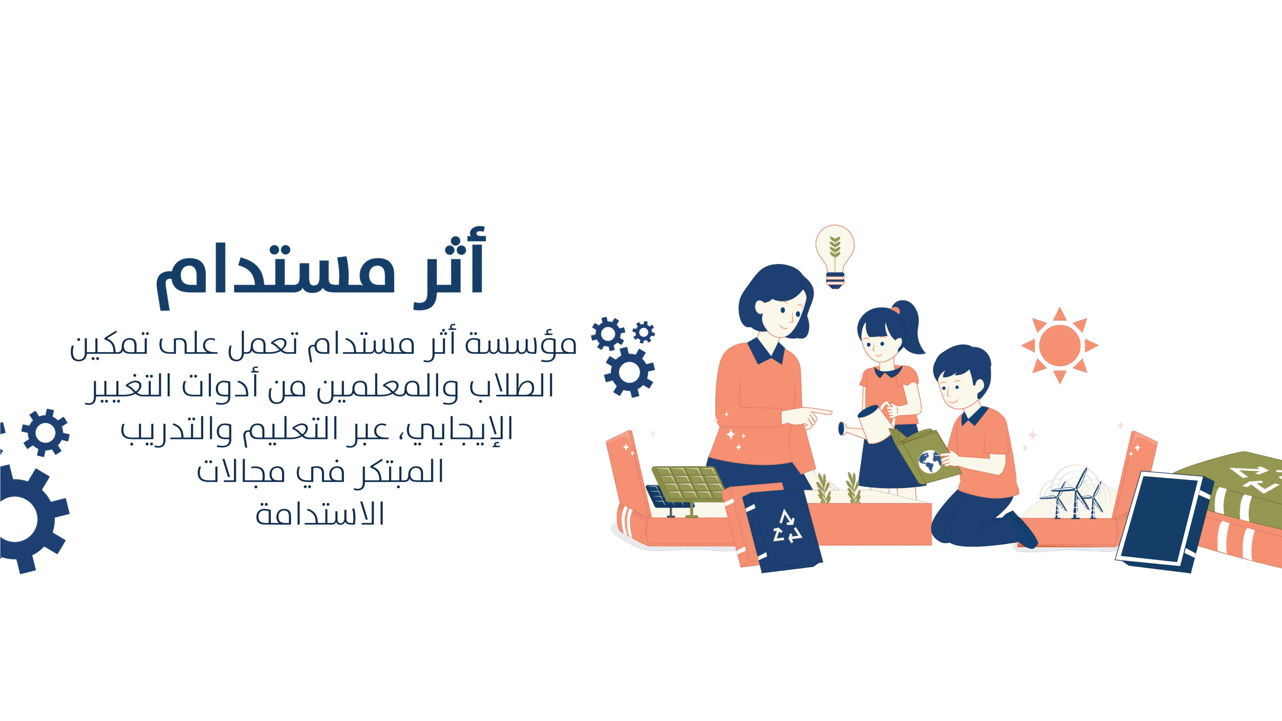 مؤسسة أثر مستدام هي مؤسسة تنموية غير هادفة للربح، تأسست بهدف ترسيخ مفاهيم التنمية المستدامة في عقول الأجيال الجديدة عبر التعليم والتدريب النوعي. تنطلق المؤسسة من إيمان راسخ بأن بناء مجتمع مستدام يبدأ من الوعي المبكر، ويعتمد على تمكين الطلاب والمعلمين من امتلاك أدوات التغيير الإيجابي.